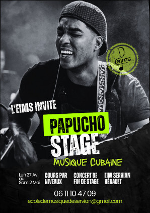 Stage cubain organisé par l’École Intercommunale de Musique de Servian, en collaboration avec le musicien Cubain Papucho Ordonez. Ce stage s’adresse aux élèves de fin de cycle 1 et aura lieu A Valros dans la salle « Ema du Ligno » de 9h30 jusqu’à 17h , il accepte tous les instruments, ainsi que le chant, et peut, si besoin, s’articuler sur deux niveaux de difficulté. Chaque musicien devra amener son pupitre, son repas du midi, mais les viennoiseries et le café seront offerts par l’école. Il se déroule sur une semaine, du lundi 27 jusqu’au vendredi, et se conclut par un concert le samedi 2 mai.